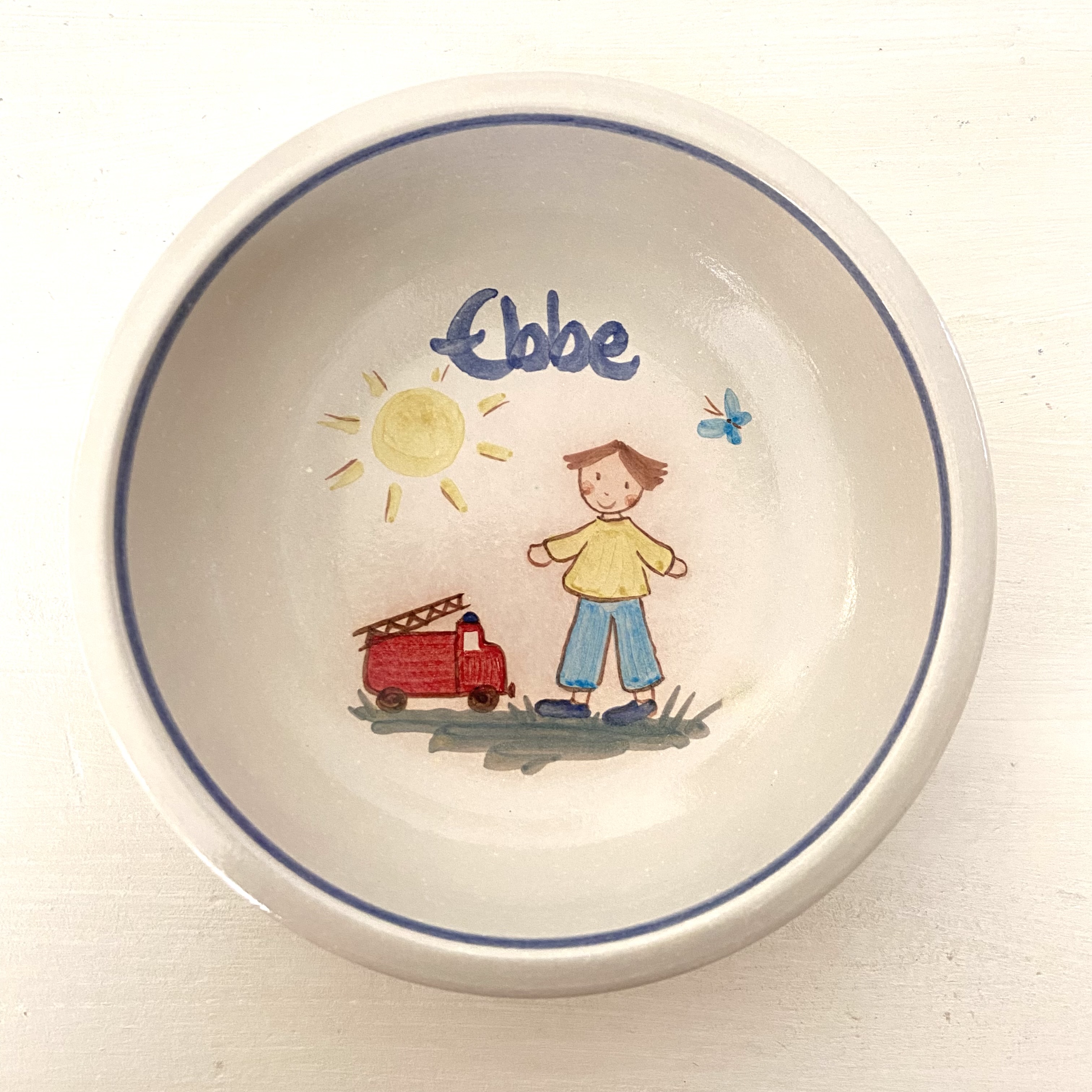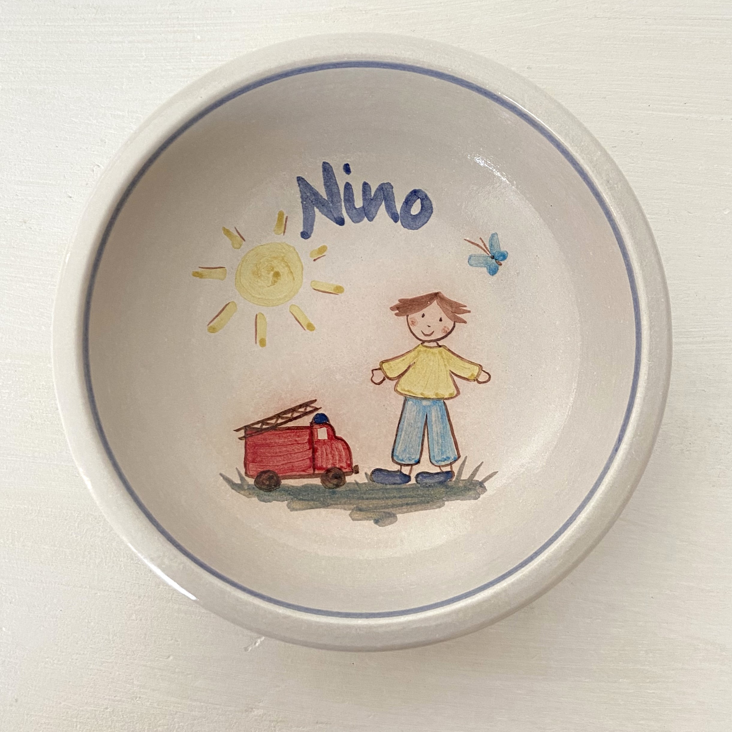 Kinderschale mit Namen, Junge mit Feuerwehr, Durchmesser 16,5 cm