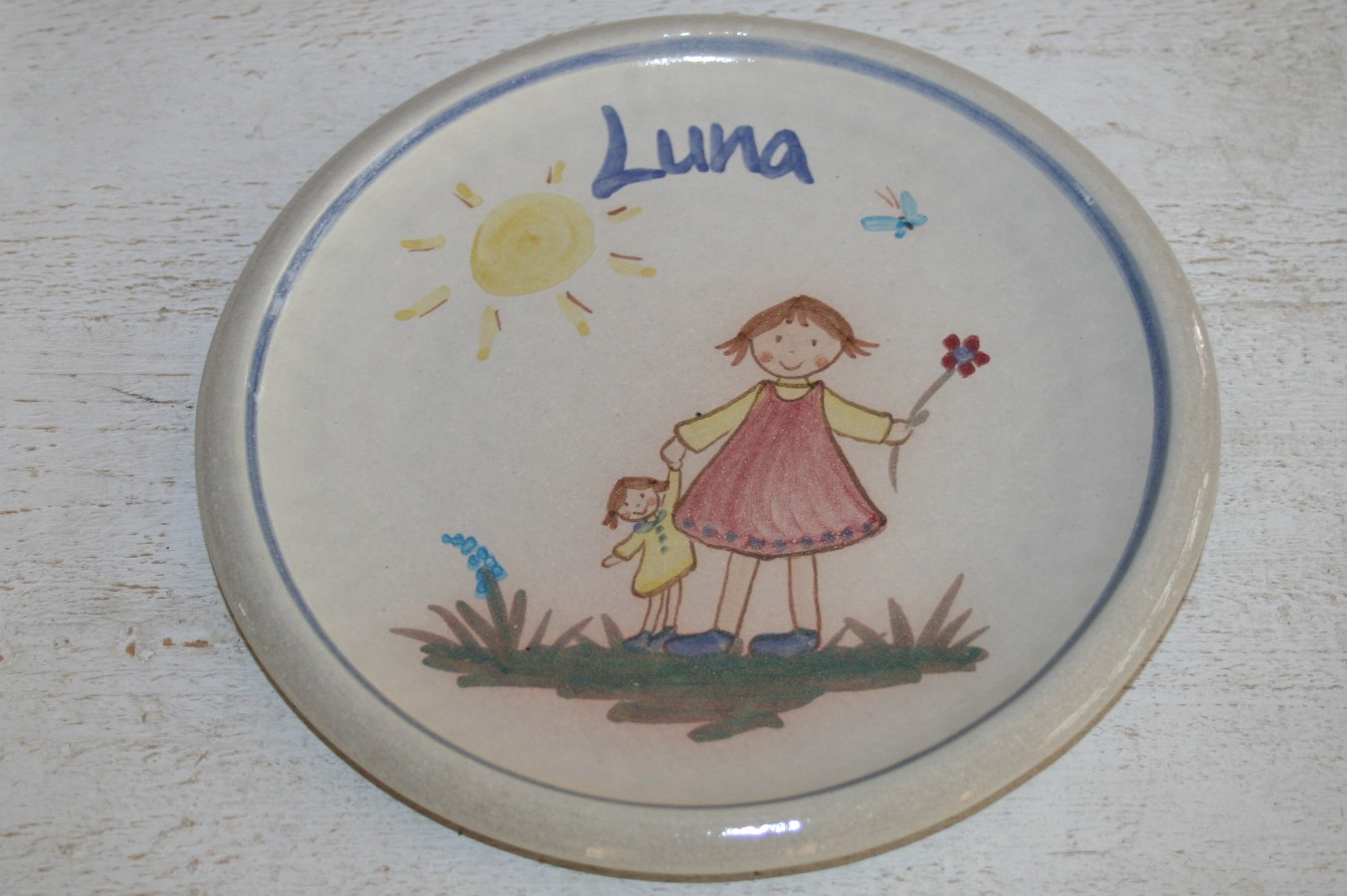 Flacher Teller mit Namen, Mädchen mit Puppe, Durchmesser 18,5 cm