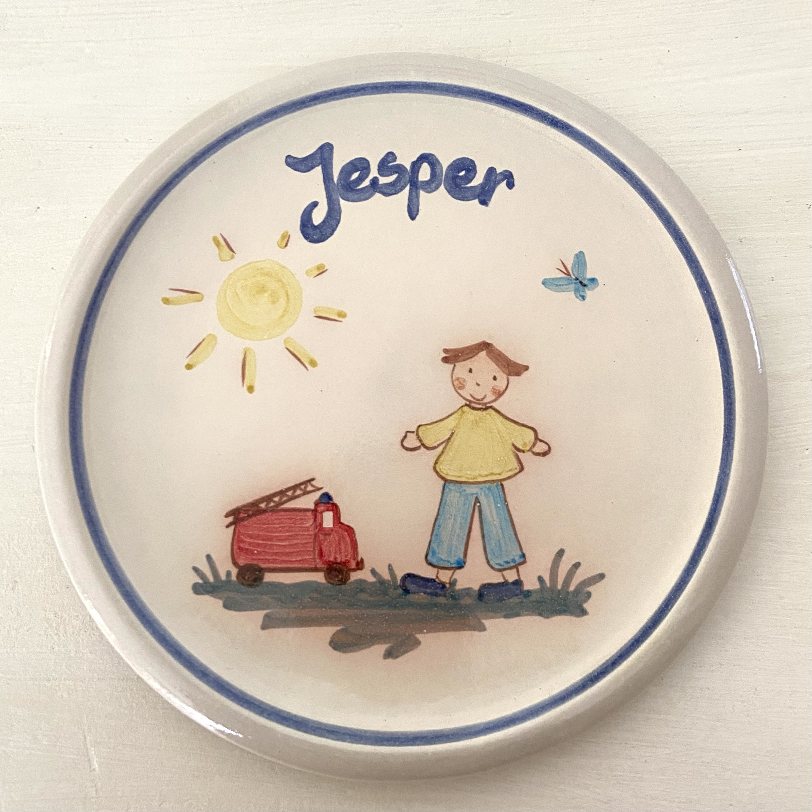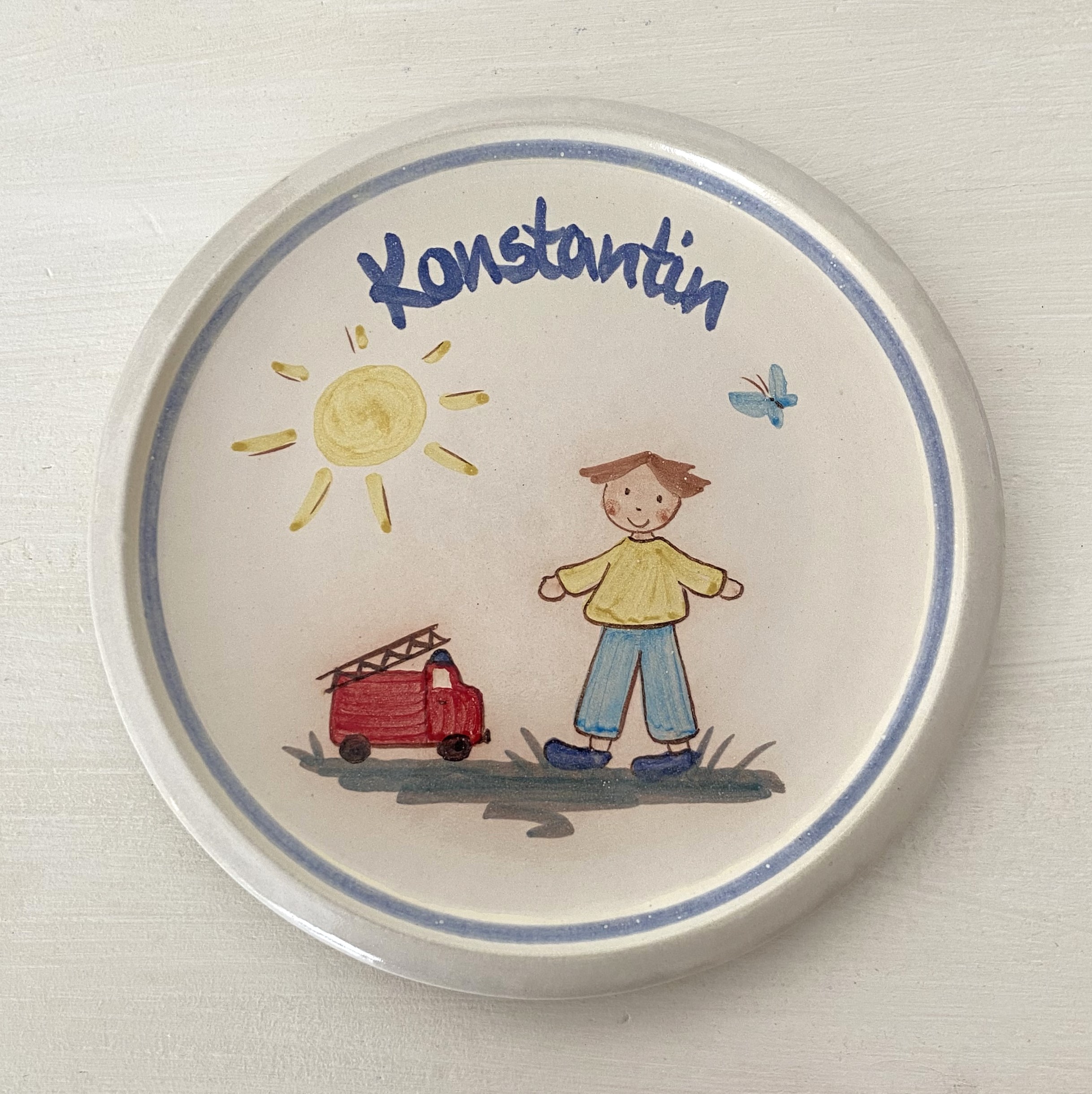 Flacher Teller mit Namen, Junge mit Feuerwehr, Durchmesser 18,5 cm